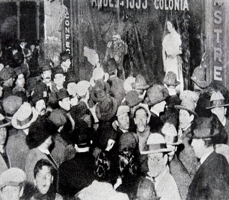 Crowds apparently gathered daily at the shop out of morbid curiosity. It became a city sensation. The mannequin stood there for approximately two weeks.