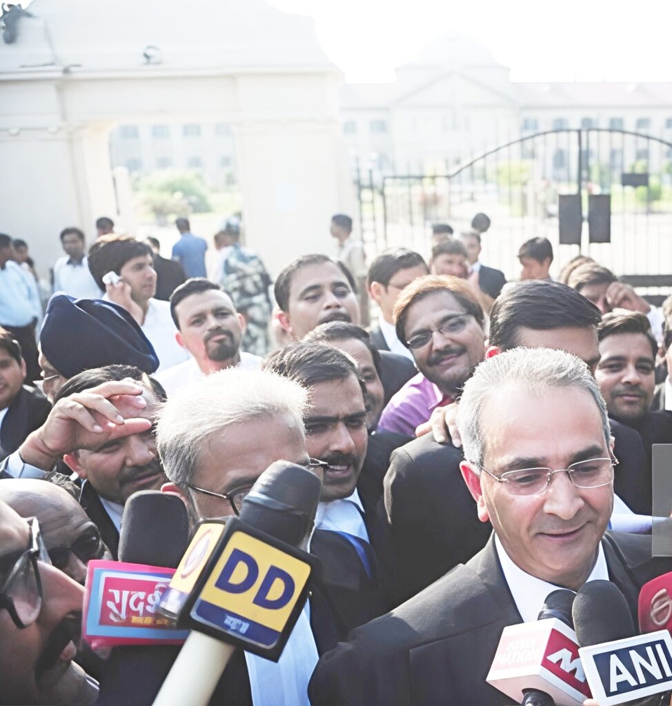 Lawyer Tanveer Ahmed Mir, who represented Dr. Rajesh Talwar and Dr. Nupur Talwar in the Allahabad High Court trial, addresses the media. Image from www.gettyimages.com