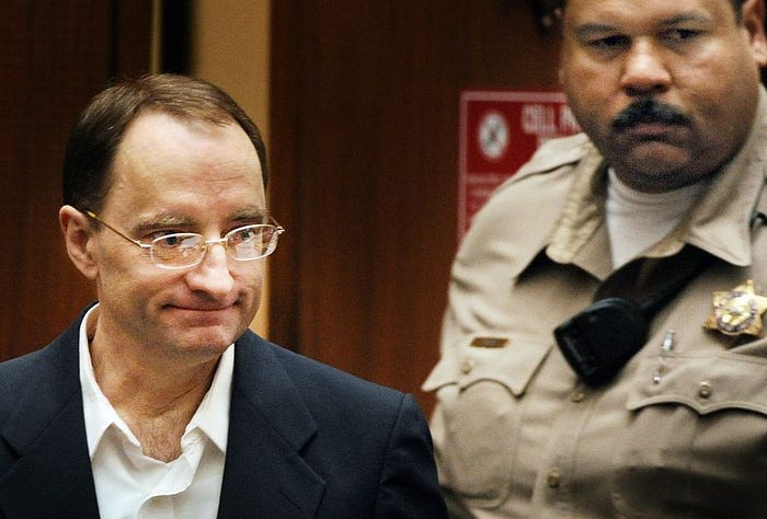 When the verdict came, he stood in a white shirt, blue blazer, gray pants, and slip-on shoes. The jury found him guilty of first-degree murder with a deadly weapon enhancement.